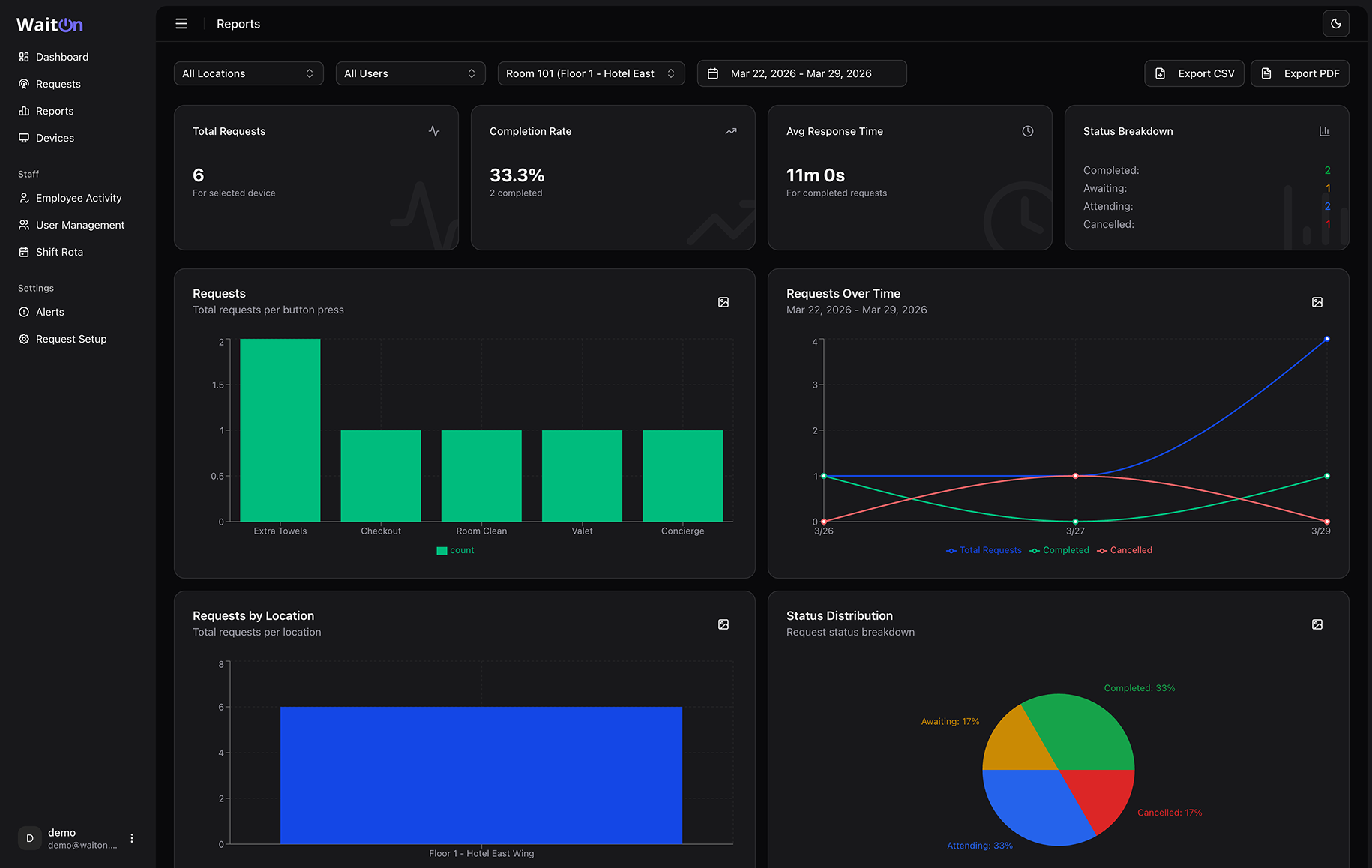 See complete reports and analytics: filter by date range, location, device, and team member. Explore charts and full request details. Export to CSV, PDF, or chart images.